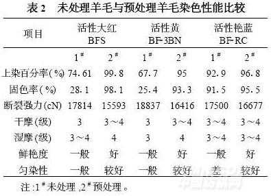 3.3預(yù)處理后的羊毛染色勻染性及成品鮮艷度比未處理羊毛有所改善。