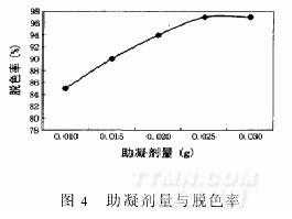 由圖4可見,投入助凝劑量不同,染料溶液的脫色率也不同,投入量為0.025g時,試樣的脫色率已在97%以上。因此,該值為適宜投放量。