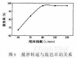 確定攪拌轉(zhuǎn)速。配制2000mL、200mg/kg直接大紅染料試樣5組,各加入食鹽3g,聚丙烯酰胺0.025g,調(diào)整pH=9,電流為2A,每組試樣選用一種電機轉(zhuǎn)速,反應(yīng)5min后,測定各試樣的脫色率。試驗結(jié)果如圖5所示。