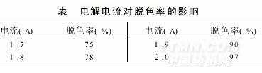 由表1可見,隨著電流的增加,脫色率增大,為使脫色率超過90%,電解電流應(yīng)選定為2A。
