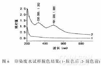 由于印染廢水(取自長(zhǎng)春華宇染整廠)組分復(fù)雜,一般至少由三種以上染料混合而成。廢水試樣脫色試驗(yàn)的方法、所用設(shè)備與藥劑與前模擬試驗(yàn)相同。由于廢水中的雜質(zhì)是電解質(zhì),在電場(chǎng)作用下產(chǎn)生電解,所以脫色率更高,脫色速度更快。選用前述試驗(yàn)的最佳參數(shù),電解5min后,用Cary500UV VIS NIR分光光度計(jì)VARI AN進(jìn)行檢測(cè)(如圖6所示),試樣的脫色率達(dá)99%以上。