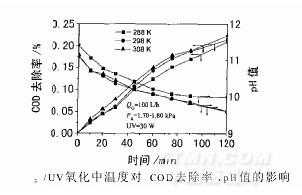對配制的原水,在不同溫度下測試O3氧化對COD去除率、pH值的影響(見圖2)。值得指出的是,單獨(dú)UV處理不能去除COD;反應(yīng)20min左右,O3/UV對色度的去除率就達(dá)到100%。