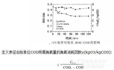 由于廢水COD和BOD都比較高,故在反應(yīng)時(shí)間內(nèi),O3/UV對COD和BOD都有去除,使廢水BOD/COD的變化不明顯(見圖3)。