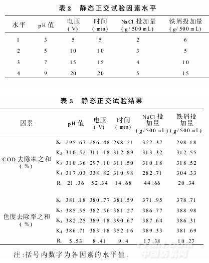 取廢水500mL,采用L16(45)正交表進(jìn)行正交試驗(yàn)因素、水平參照若干單色配制水處理工藝條件來確定分別是pH值、電解電壓、電解時(shí)間、NaCl投加量和內(nèi)電解槽鐵屑投加量等五個(gè)因素,每因素取四個(gè)水平(見表2),每個(gè)試驗(yàn)重復(fù)一次。?。茫希暮蜕热コ势骄底鳛樵u(píng)價(jià)指標(biāo)對結(jié)果進(jìn)行分析。試驗(yàn)結(jié)果如表3。
