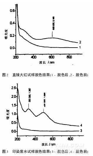對單一染料的直接大紅試樣在電解電流為2A,脫色時間6min,攪拌轉速80r/min,pH值為8~10條件下進行脫色實驗,用Cary500UV-VIS-NIRSpectrophotometerVARIAN進行檢測,結果如圖2所示,脫色率達97.69%。