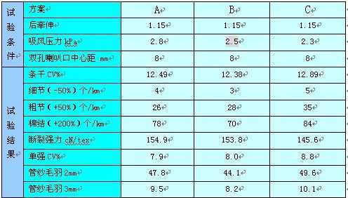 根據(jù)對比試驗(yàn)確定,吸風(fēng)壓力在2.5KPa時(shí)條干、棉結(jié)、毛羽等指標(biāo)優(yōu)于或同等于2.8KPa時(shí)的指標(biāo),在考慮節(jié)省能源成本,紗線質(zhì)量好的前提下,選擇方案B:2.5KPa的吸風(fēng)壓力。
