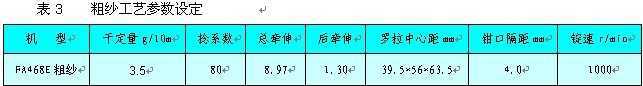 為了加強(qiáng)對牽伸區(qū)纖維的控制,粗紗工藝采用“小隔距、輕定量、中檔加壓、較小的后區(qū)牽伸、低速度”的工藝配置原則。由于細(xì)紗采用賽絡(luò)紡雙根粗紗喂入,粗紗定量宜偏輕掌握,定量為3.5g/10m。賽絡(luò)緊密紡細(xì)紗退繞時(shí)引紗距離比普通環(huán)錠紡引紗距離長,張力較大,粗紗退繞時(shí)容易產(chǎn)生斷頭,為保證粗紗正常退繞,在細(xì)紗不出“硬頭”的前提下,適當(dāng)增大粗紗捻系數(shù),即可減少粗紗退繞時(shí)意外伸長,又可賽絡(luò)緊密紡時(shí)增加細(xì)紗前區(qū)須條緊密度,從而減少成紗細(xì)節(jié)及毛羽,提高成紗強(qiáng)力,但粗紗捻系數(shù)不易過大,否則細(xì)紗牽伸不開吐硬頭。一般粗紗捻系數(shù)掌握在75~80之間,我公司采用80捻系數(shù)。為確保粗紗品質(zhì),適當(dāng)降低錠速。小紗錠速為900r/min,大紗為950r/min,,中紗采用1000r/min,可以減少斷頭率,保證粗紗生產(chǎn)正常運(yùn)行。