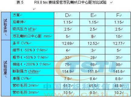 賽絡(luò)緊密紡的工藝配置是一項(xiàng)綜合性很強(qiáng)的工作,羅拉隔距、后區(qū)牽伸倍數(shù)、搖架壓力、細(xì)紗捻系數(shù)、鋼令鋼絲圈型號、雙孔喇叭口中心距、吸風(fēng)壓力等,必須逐項(xiàng)優(yōu)選。由于R9.8 tex賽絡(luò)緊密紗屬于我公司的新產(chǎn)品,沒有現(xiàn)成的經(jīng)驗(yàn)可循。羅拉隔距、細(xì)紗捻系數(shù)我們參考國產(chǎn)賽絡(luò)紡長車60支紗的經(jīng)驗(yàn),確定為羅拉隔距44*63mm,捻度1088捻/米,捻系數(shù)為341;后區(qū)牽伸剛開始選用1.19倍時(shí)條干不好,后羅拉有輕微打頓現(xiàn)象,原因是車身較長,牽伸羅拉容易出現(xiàn)扭振,改為1.15后打頓現(xiàn)象消除,條干明顯好轉(zhuǎn);搖架壓力:前16*中10*后12 kg,前皮輥加壓由偏心多邊塊直接調(diào)節(jié)。對于其他參數(shù),做出如下對比試驗(yàn)后優(yōu)選。