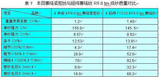 賽絡(luò)緊密紡與賽絡(luò)紡R9.8 tex成紗質(zhì)量比較(見表7)