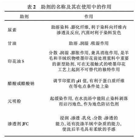 羊絨纖維的化學(xué)組成主要為角脘,它含有能電離的酸性基和堿性基,能與適量的酸和堿結(jié)合。羊絨對(duì)堿的抵抗能力較差,pH值大于10時(shí),羊絨纖維的損傷比較嚴(yán)重,而冷的稀醋酸對(duì)羊絨沒有破壞作用,當(dāng)pH值在5(等電點(diǎn)附近)時(shí),不會(huì)影響纖維強(qiáng)力。綜合上述組分作用的分析并以此為依據(jù),工廠采用色號(hào)C0101標(biāo)準(zhǔn)白,線密度16.7tex×2的機(jī)織羊絨坯布,通過糊料(海藻酸鈉+改性淀粉或DGT-2)、助劑(元明粉、尿素、滲透劑JFC、甘油、冰醋酸、印花油S)各組分的正交試驗(yàn),特別是糊料和助劑的選用。最終得出羊絨織物前處理漿料配方為:糊料(海藻酸鈉+改性淀粉)4.0%(3.5%亦可),元明粉10%,尿素5%,滲透劑JFC1%,甘油4%,冰醋酸(醋酸鈉)調(diào)節(jié)pH值至5~6,印花油S3%,總用量為100%,根據(jù)不同的量來決定水的量,補(bǔ)充滿即可。