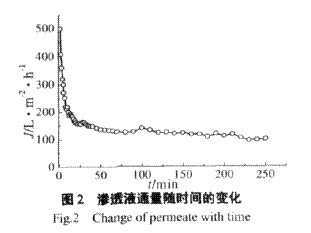 圖2示出陶瓷膜過濾廢水的通量隨時(shí)間的衰減變化,其中跨膜壓差為0.075MPa,錯(cuò)流速度為2.5m·s-1。裝置啟動(dòng)后通量在開始的20min內(nèi)急劇下降,之后變化幅度逐漸減小,隨著裝置運(yùn)行時(shí)間的增加最終通量穩(wěn)定在100L·m-2·h-1左右。前20min通量的急劇下降是由于廢水中的顆粒物質(zhì)使陶瓷膜產(chǎn)生膜污染,主要為固體懸浮顆粒沉積在膜面形成凝膠極化層、小顆粒部分堵塞膜孔、顆粒在膜表面吸附而形成的[4]。