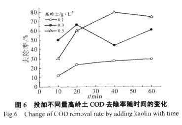 從圖6中可以看出,在廢水中投加了高齡土的陶瓷膜對COD的去除率要大于不投加的COD去除率,并且隨著高嶺土在廢水中濃度的上升COD的去除率也呈現(xiàn)了上升的趨勢。分析其原因是廢水中含有一定量的游離微生物和可溶性細胞產(chǎn)物,投加高嶺土形成動態(tài)膜能增加對分子量較大的可溶性細胞產(chǎn)物和游離微生物的截留[9],從而提高了廢水COD的去除率。高嶺土投加量為0.5g·L-1時較投加0.3g·L-1時COD去除率增加不明顯,而且隨著運行時間的增加去除率還會有一定程度的下降,所以綜合考慮各種因素認為在廢水原液中投加0.3g·L-1的高嶺土對廢水COD去除效果最優(yōu),平均去除率達到50%左右。