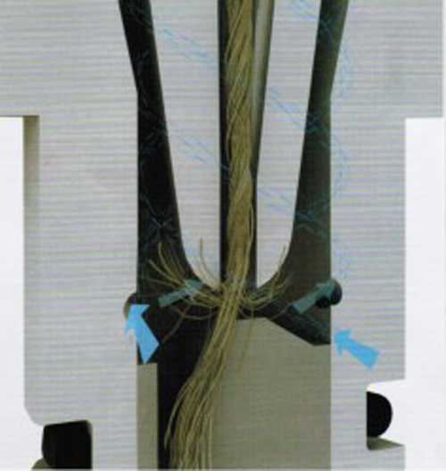 受到牽伸后的條子離開牽伸系統(tǒng)后即進(jìn)入紡紗噴嘴,條子的2/3的纖維形成平行的紗芯,其余的纖維,前面部份捻合進(jìn)紗芯,后面部份則纏繞在平行的紗芯周圍,通過氣流的作用形成紗線,從而生產(chǎn)出具有新的結(jié)構(gòu)特性的紗線(圖5)