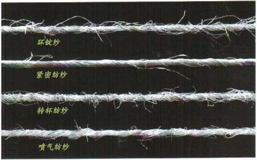 圖8、立達公司生產(chǎn)的環(huán)錠紗、緊密紗、轉(zhuǎn)杯紗及噴氣紗的外觀比教