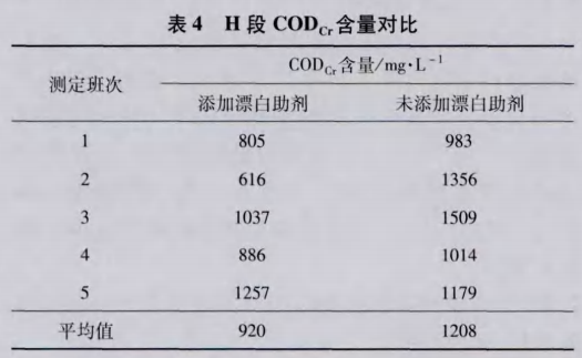 為了了解漂白助劑的添加對(duì)白水排放的影響,測(cè)定了連續(xù)5個(gè)班次H段排水CODcr含量,并與未添加漂白助劑的情形進(jìn)行對(duì)比,結(jié)果見表4。