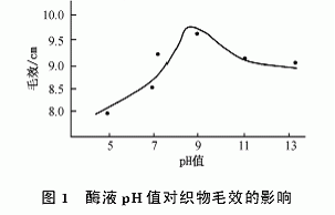 酶液pH值會影響酶蛋白的構(gòu)象和酶分子及底物分子的解析狀態(tài),從而影響酶的活性。實驗數(shù)據(jù)表明,當(dāng)pH=8.5~9.0時,織物的毛效、白度、強度最佳。如pH值過低,酶的活力就低,且纖維素纖維不耐酸,織物有泛黃現(xiàn)象;如pH值過高,酶蛋白又會失去活力,因此,應(yīng)控制酶液pH值為呈弱堿性,織物上的蠟質(zhì)和脂肪類物質(zhì)易分解,可保證酶蛋白起到最佳的催化作用,促進生化反應(yīng)的正常進行。