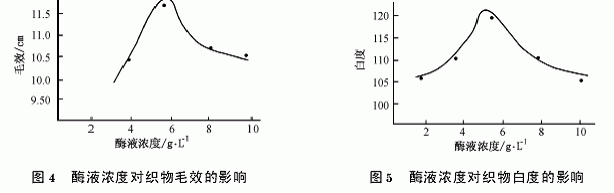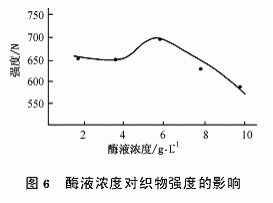 隨著酶液濃度的增加,反應(yīng)速度逐漸增加,底物的有效轉(zhuǎn)化也增加,織物的毛效、白度、強度也隨之增加;但若酶液濃度過大,又會使棉纖維過度水解而產(chǎn)生崩解,影響織物的毛效、白度和強度。圖6表明,高濃度酶液使織物的強度損失最大。實驗表明,酶液濃度在6g/L左右時合適。