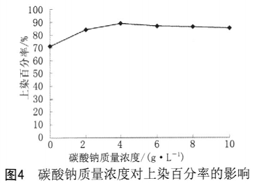 從表2可以看出,隨著碳酸鈉質(zhì)量濃度的增加,蠶蛹蛋白粘膠長絲白度有稍微提高趨勢,當碳酸鈉質(zhì)量濃度超過4g/L白度基本不變。由圖4可以看出,碳酸鈉質(zhì)量濃度在0?2g/L時,上染百分率顯著提高,當其質(zhì)量濃度為4g/L時,上染百分率達到最高。