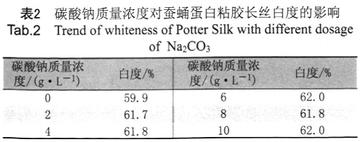 蠶蛹蛋白粘膠長絲按照1.3工藝進行同浴法改性漂白處理,改變碳酸鈉質(zhì)量濃度,固定助劑質(zhì)量濃度20g/L,硅酸鈉質(zhì)量濃度4g/L,尿素質(zhì)量濃度4g/L,30%雙氧水質(zhì)量濃度15g/L,水洗、烘干后測白度。然后按照1.4工藝染色,測上染百分率。試驗結(jié)果見圖4和表2。