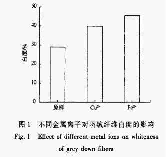 為考察不同金屬離子對(duì)羽絨纖維白度、蓬松度影響,在預(yù)處理時(shí)間相同的條件下改變金屬離子種類(lèi),測(cè)試羽絨白度,結(jié)果見(jiàn)圖1。