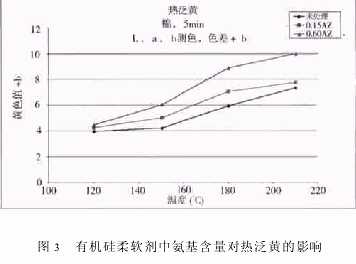 為了避免熱泛黃或使熱泛黃降至最低程度,可采用諸多方法。最簡單的一種是將氨基基團含量降到最小限度。低氨基含量的柔軟劑要比高氨基含量的柔軟劑泛黃程度低(圖3),也有許多化學方