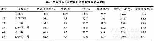 (2)織物的斷強和斷裂延伸度.在加入二醇和甘醇后.織物的斷強和斷裂延伸度都有明顯的提高.其原因可能是交聯(lián)程度降低造成的。