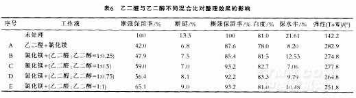 用乙二醇作為添加劑時.織物強力和白度均有較大的提高.乙二醛和乙二醇比例大小會影響織物整理效果.進行不同混合比試驗.為了選出它們的最佳混合比.