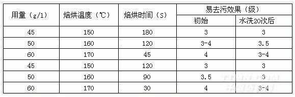 分析:日本明成化學易去污整理劑SRM-65為親水性易去污整理劑,在空氣中干防油污性較汽巴ZSR差,但在水中的織物上的油污易洗滌性很好。綜合考慮濃度、溫度、時間等各種因素的影響,我們選擇SRM-65