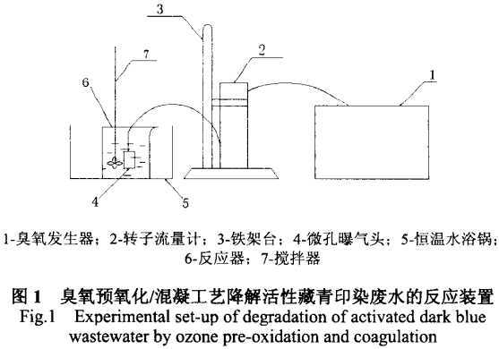 圖1為臭氧預(yù)氧化/混凝處理活性藏青廢水的反應(yīng)裝置。用電子天平(日本島滓,AY220),~取一定量的活性藏青(汕頭市西隴化工』一有限公司)配置所需濃度的活性藏青廢水于燒杯中,用酸度計(jì)(上海雷磁儀器廠,pHS一3c)測(cè)定pH,用硫酸(成都市科龍化工試劑廠)或氧氧化鈉(成都