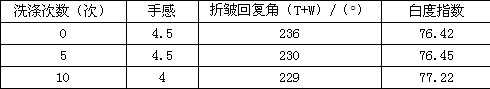 由表2可以看出,經(jīng)不黃變硅油整理的織物水洗前后的折皺回復(fù)角、手感和白度指數(shù)的變化很小,即整理后織物的