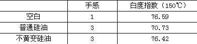 由表1可以看出,不黃變硅油在白度上要比普通硅油有明顯的提高,這是因?yàn)椴稽S變硅油是由位阻較大的硅烷偶聯(lián)劑合成的,并且與硅烷偶聯(lián)劑反應(yīng)后,使氨烷基在聚硅氧烷側(cè)鏈上均勻地接枝,在加入改性劑后又將氨基中的活潑氫消耗掉,降低了氨基氧化泛黃的幾率,所以,織物的白度要比原來還要好,比普通的氨基硅油更好,同時(shí)織物的柔軟性由于氨基分布均勻,得到比普通硅油更好的柔軟效果。