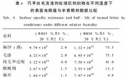 (3)有文獻(xiàn)建議衡量表面電阻的抗靜電性能的優(yōu)劣分為:Rs>1013Ω者為抗靜電性能劣,1011Ω~1012Ω為較差,<1010Ω為一般,<109Ω為良好。而在紡織業(yè)評(píng)判半衰期是10s以內(nèi)為抗靜電。實(shí)驗(yàn)顯示大部分柔軟劑對(duì)合成纖維的效果明顯,而有些產(chǎn)品對(duì)毛、絲、混紡等效果不明顯,其中柔軟劑