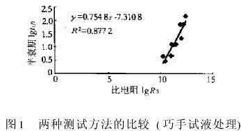 圖1顯示了兩種測(cè)試方法的相關(guān)性,各種纖維的衰變速度常數(shù)的對(duì)數(shù)是和電阻對(duì)數(shù)成正比,即表面比電阻越大,半衰期越長(zhǎng),電荷逸散速度也越慢。