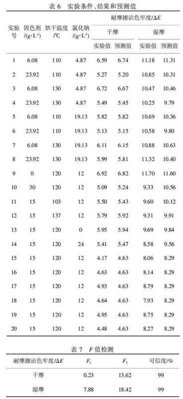 表7數(shù)據(jù)表明:活性金黃MES染色織物各項(xiàng)色牢度的色差值可信度都達(dá)到99%.表6中的預(yù)測值與實(shí)驗(yàn)值比較接近,說明二者擬合得較好,可用于預(yù)測活性金黃MES染色織物的耐摩擦色牢度色差值,并進(jìn)一步優(yōu)化其固色工藝條件.