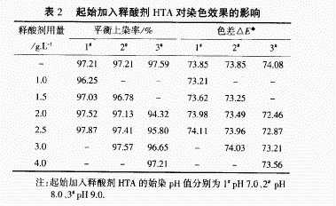 根據(jù)染色升溫曲線,起始pH值分別取7、8、9,測(cè)-定釋酸劑HTA 2.09/L在起始和沸點(diǎn)加人時(shí)空白染浴的pH值變化.結(jié)果如表1所示.
