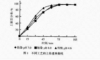 選擇pH 7.0、釋酸劑用量1.5留L及pH 8.0,釋酸劑用量2.0歲L與傳統(tǒng)工藝對(duì)比,上染速率見圖1.