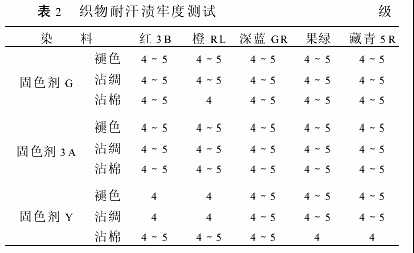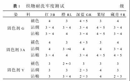 從表1可知,固色劑G和固色劑3A的耐洗牢度相仿,比固色劑Y的耐洗牢度提高1級(jí)左右,而且固色劑G的沾綢、沾棉牢度也較高。