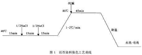 1.2.2染色工藝選用活性艷紅K-BP對織物進(jìn)行染色,其中浴比為20∶1,染料濃度為4%(o.w.f),氯化鈉用量為50g/L,碳酸鈉用量為15g/L,浴比20∶1.皂洗條件為碳酸鈉2g/L,皂粉2g/L,浴比20∶1,90℃皂洗20min.染色工藝曲線如圖1所示.