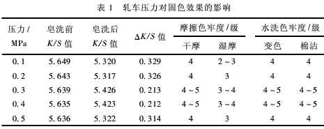 2.1.1軋車壓力的優(yōu)選棉織物按照1.2.2工藝染色,然后按照1.2.3工藝進(jìn)行固色處理,改變軋輥壓力,固定蛋白助劑用量20g/L,交聯(lián)劑WLS為12g/L,氫氧化鈉為6g/L.固色處理的織物水洗至中性,晾干后測(cè)試織物的K/S值和染色牢度,結(jié)果見表1.