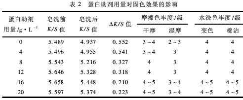 2.1.2蛋白助劑用量的優(yōu)選棉織物按照1.2.2工藝染色,然后按照1.2.3工藝進(jìn)行固色處理,改變蛋白助劑用量,固定軋輥壓力為0.3MPa,交聯(lián)劑WLS為8g/L,氫氧化鈉為6g/L.固色處理的織物水洗至中性,晾干后測(cè)試織物的K/S值和染色牢度,結(jié)果見表2.