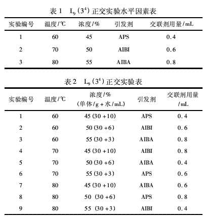 在帶有攪拌器、溫度計、滴液漏斗的100 mL三口燒瓶中添加30 g 60%的DMDAAC、9 g去離子水及0.6 mL 2%的亞甲基雙丙烯酰胺(交聯(lián)劑)、0.6 mL 1%的EDTA二鈉。升溫至60℃,加入0.75 mL 5.4%的聚合引發(fā)劑過硫酸氨水溶液,控制攪拌速度,60℃保溫聚合直至達到規(guī)定的粘度。表1、表2分別為合成工藝的條件及其變量正交表。
