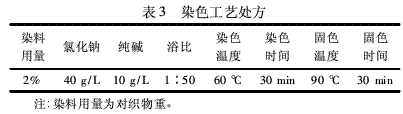 為準(zhǔn)確驗(yàn)證固色劑PDMDAAC對(duì)活性染料的固色效果,本實(shí)驗(yàn)所用染布均為市售純棉漂白布在實(shí)驗(yàn)室染色得到。為提高染色效果,本實(shí)驗(yàn)采用高溫型活性紅K-2G。其染色具體工藝處方如表3所示。