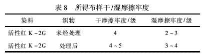 本實(shí)驗(yàn)采用浸漬固色法對(duì)染后布樣進(jìn)行固色,然后用干/濕摩擦牢度測(cè)試儀來測(cè)定固色后試樣的干/濕摩擦牢度。測(cè)定結(jié)果如表8所示。