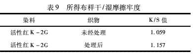 采用思維士電腦測(cè)色配色系統(tǒng)V.2000測(cè)試經(jīng)浸漬固色法固色后所得布樣的K/S值,其結(jié)果如表9所示。