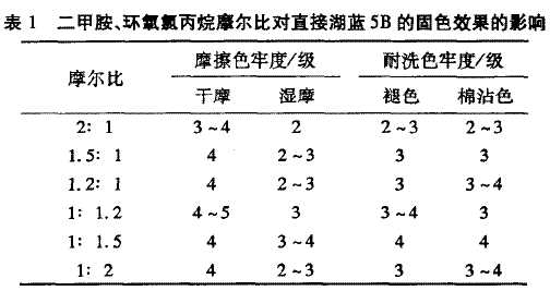 2.1.1二甲胺、環(huán)氧氯丙烷摩爾比對固色劑的影響按照1.3固色劑的合成方法進(jìn)行合成實(shí)驗(yàn),二甲胺、環(huán)氧氯丙烷反應(yīng)2h后,滴加占反應(yīng)單體總質(zhì)量2%的四乙烯五胺,反應(yīng)2h后升溫至70℃.改變二甲胺和環(huán)氧氯丙烷的摩爾比,將所得的一系列產(chǎn)品分別對直接湖藍(lán)5B染色的棉織物進(jìn)行固色處理,測試其各項(xiàng)色牢度,結(jié)果如表1所示.