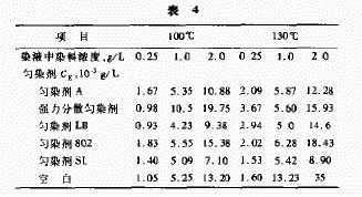 將勻染劑(濃度為1g/L)加入到染裕中時,其對分散染料分散穩(wěn)定性的影響見表4。