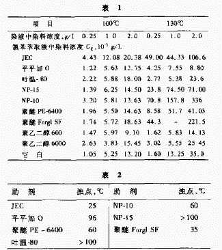 非離子助劑(濃度1 g/L)的影響見表1。表2為各種非離子助劑的濁點。