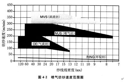 目前,對MJS噴氣紡紗機的綜合評價可概括如下:超大的牽伸倍數(shù)(300倍)、特殊的成紗結構(包纏、包芯、花式)、驚嘆的高速度(如圖4—2所示)、大幅度降低成本(省地省人)、無人化省力化、工序一體化、優(yōu)良的生產(chǎn)環(huán)境及統(tǒng)籌的管理系統(tǒng)。