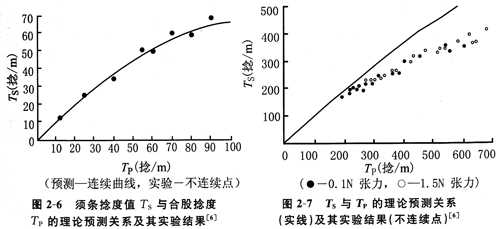 圖2—6中,Emmanuel等通過對兩根橡膠單絲進(jìn)行動態(tài)加捻,考察了匯聚點(diǎn)以上的須條實測捻度值(Ts)與合股捻度(Tp)的關(guān)系,并與理論預(yù)測曲線作比較。