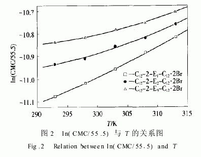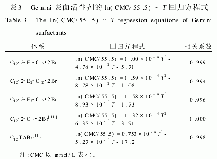 Islam指出普通離子型表面活性劑的ln(CMC/555)~T曲線通常呈現(xiàn)U形狀[10]。圖2顯示C122EnC12·2Br的ln(CMC/555)隨T上升而增大,這和C122C12·2Br以及C12TABr的趨勢一致[11],表明所考察的溫度范圍在U形曲線的右邊,回歸方程列于表3。